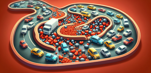 In this city, the smaller vehicles are more likely to crash between the bollards, causing damage and damage to the walls, and more cars can enter, forming a pile-up that eventually spreads onto the road and blocks it (plaque formation in arteries).